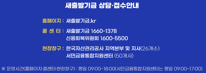 - 현장창구 신청시 : 새출발기금 콜센터나 신용회복위원회 콜센터로 문의해 방문일자와 시간을 예약 → 신분증을 지참고 방문