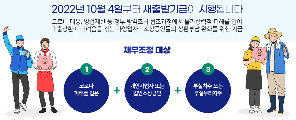 새출발기금은 코로나 피해를 입은 개인사업자 또는 소상공인으로, 부실(연체 3개월 이상 차주) 또는 부실우려차주(연체 3개월 미만 차주)는 새출발기금을 통해 채무조정을 신청할수 있습니다.