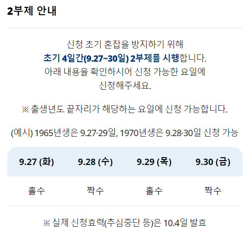 인터넷사이트를 통한 사전신청은 홀짝제로 운영이 됩니다. 출생연도가 홀수면 27일과 29일에, 짝수면 28일과 30일에 사전신청이 가능합니다.