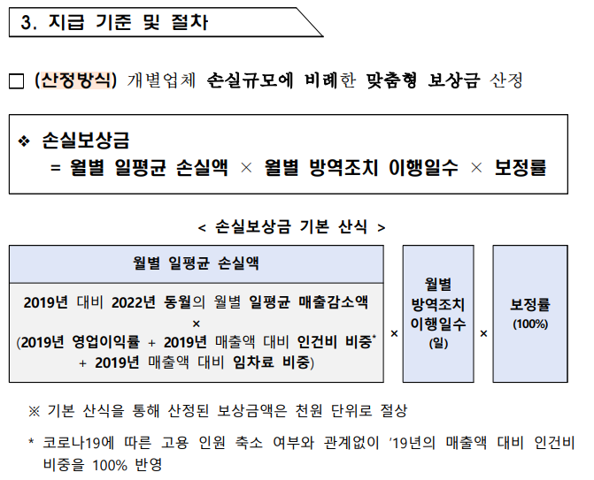 손실 보상금 금액에 대해 알아보겠습니다. 지난 1분기(1~3월)와 동일하게 보정률을 100%로 영업이익 감소분 전체를 보상하게 됩니다. 하한액도 100만원으로 유지 합니다.
