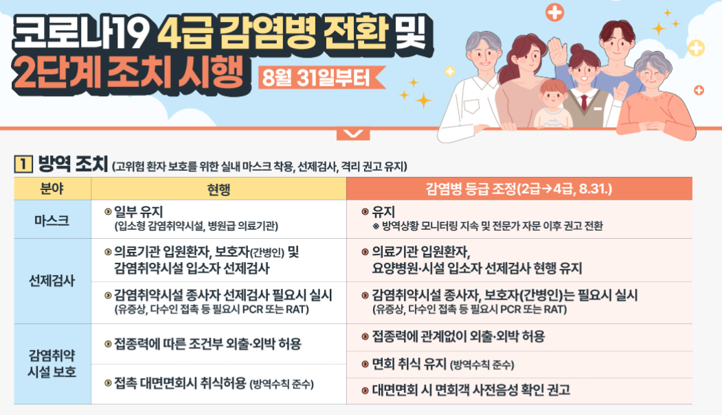 | 분야 | 현행 | 감염병 등급 조정(2급→4급) | |