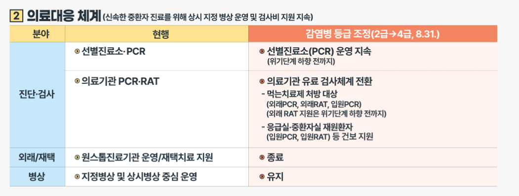 먹는치료제 처방 대상군, 응급실· 중환자실 재원환자 등 고위험군이 신속하게 검사와 치료를 받을 수 있도록 검사비 일부 지원은 지속합니다. 또한 위기단계 하향 전까지 선별진료소 운영은 지속합니다.