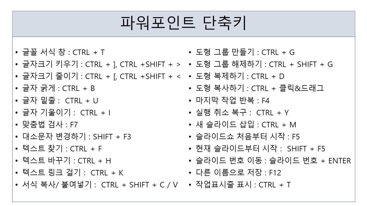 이렇게 파워포인트 단축키를 정리해 보았습니다.