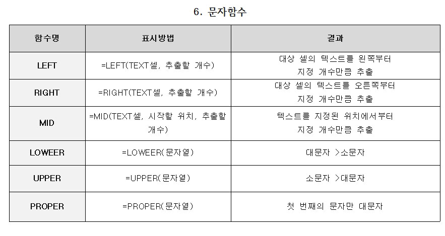 | UPPER | =UPPER(문자열) | 소문자 >대문자 |