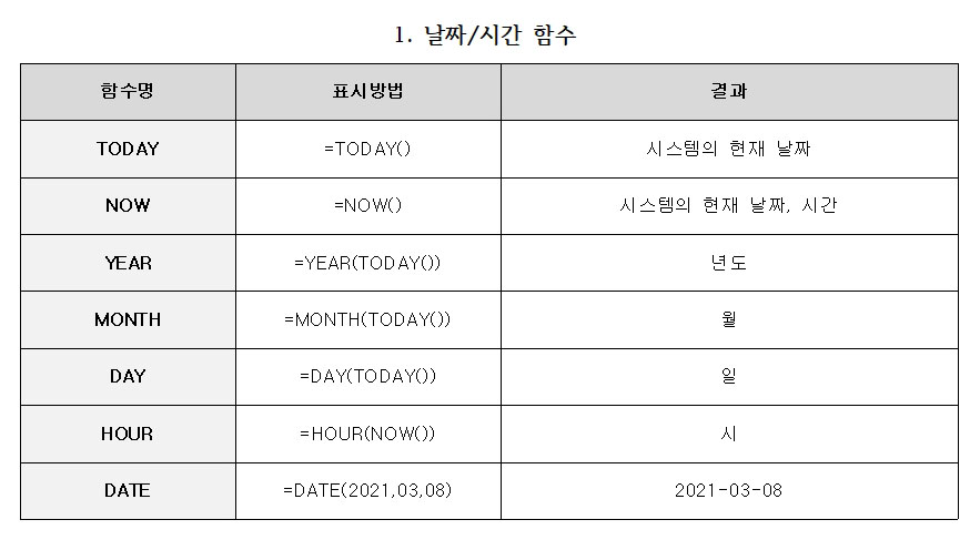 | NOW | =NOW() | 시스템의 현재 날짜, 시간 |