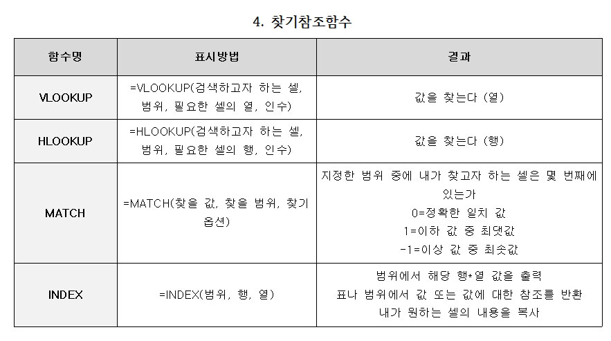 | MATCH | =MATCH(찾을 값, 찾을 범위, 찾기 옵션) | 지정한 범위 중에 내가 찾고자 하는 셀은 몇 번째에 있는가 0=정확한 일치 값 1=이하 값 중 최댓값 -1=이상 값 중 최솟값 |